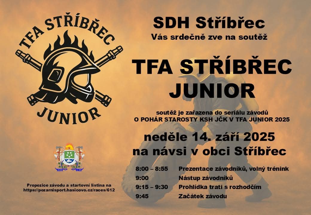 sbor dobrovolných hasičů Stříbřec Vás srdečně zve na historicky 1. ročník dětské hasičské soutěže TFA Stříbřec JUNIOR (Železný hasič junior), v neděli 14.9.2025, začátek závodu cca 9:45 hod na návsi ve Stříbřeci.