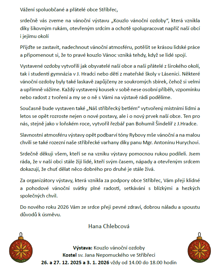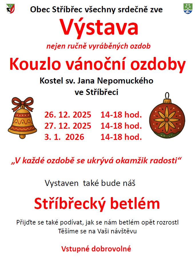 Výstava: Kouzlo vánoční ozdoby, Kostel sv. Jana Nepomuckého ve Stříbřeci 26. a 27. 12. 2025 a 3. 1. 2026 vždy od 14.00 do 18.00 hodin