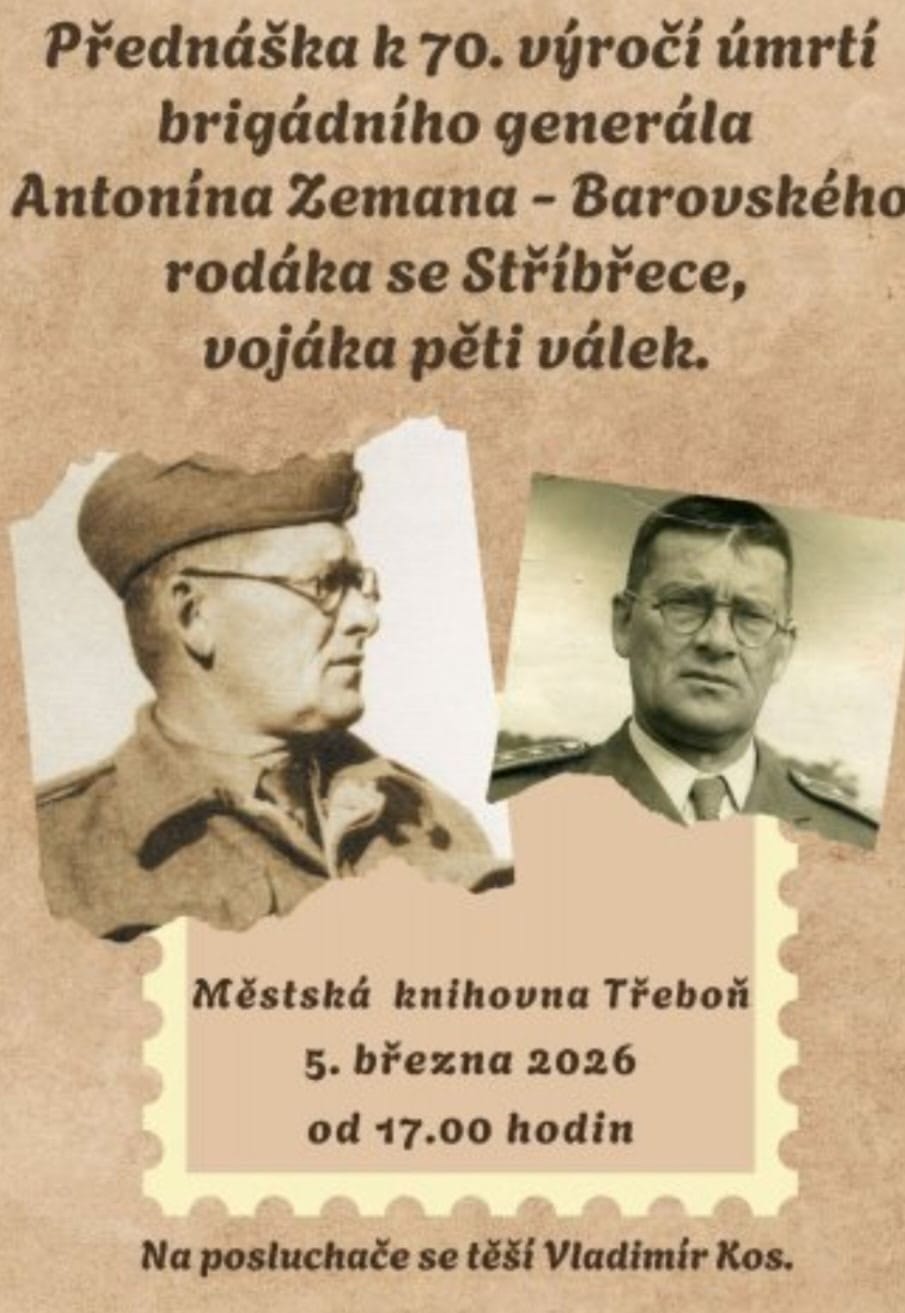 Přednáška k 70. výročí úmrtí brigádního generála A. Zemana-Barovského, rodáka ze Stříbřece, Třeboň-knihovna 5. března 2026 od 17 hod.